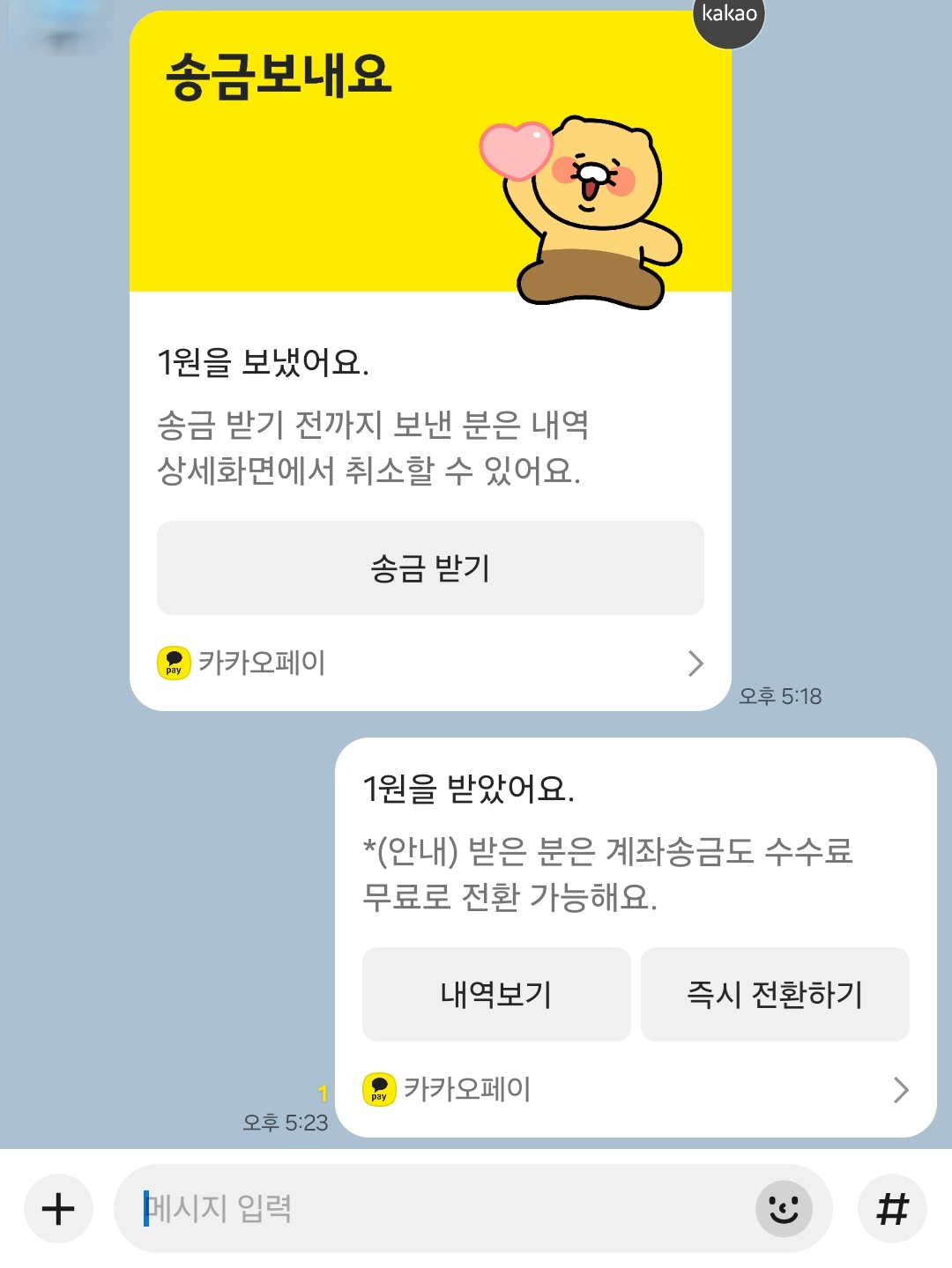 - 돈 받기 완료하기: 자녀가 보낸 카카오톡 채팅방으로 들어간다. 노란색 봉투 메시지에 있는 '송금받기' 버튼을 누른다. "송금 받기 완료"라는 문구가 나오면 돈이 내 카카오페이에 안전하게 들어온 것이다.